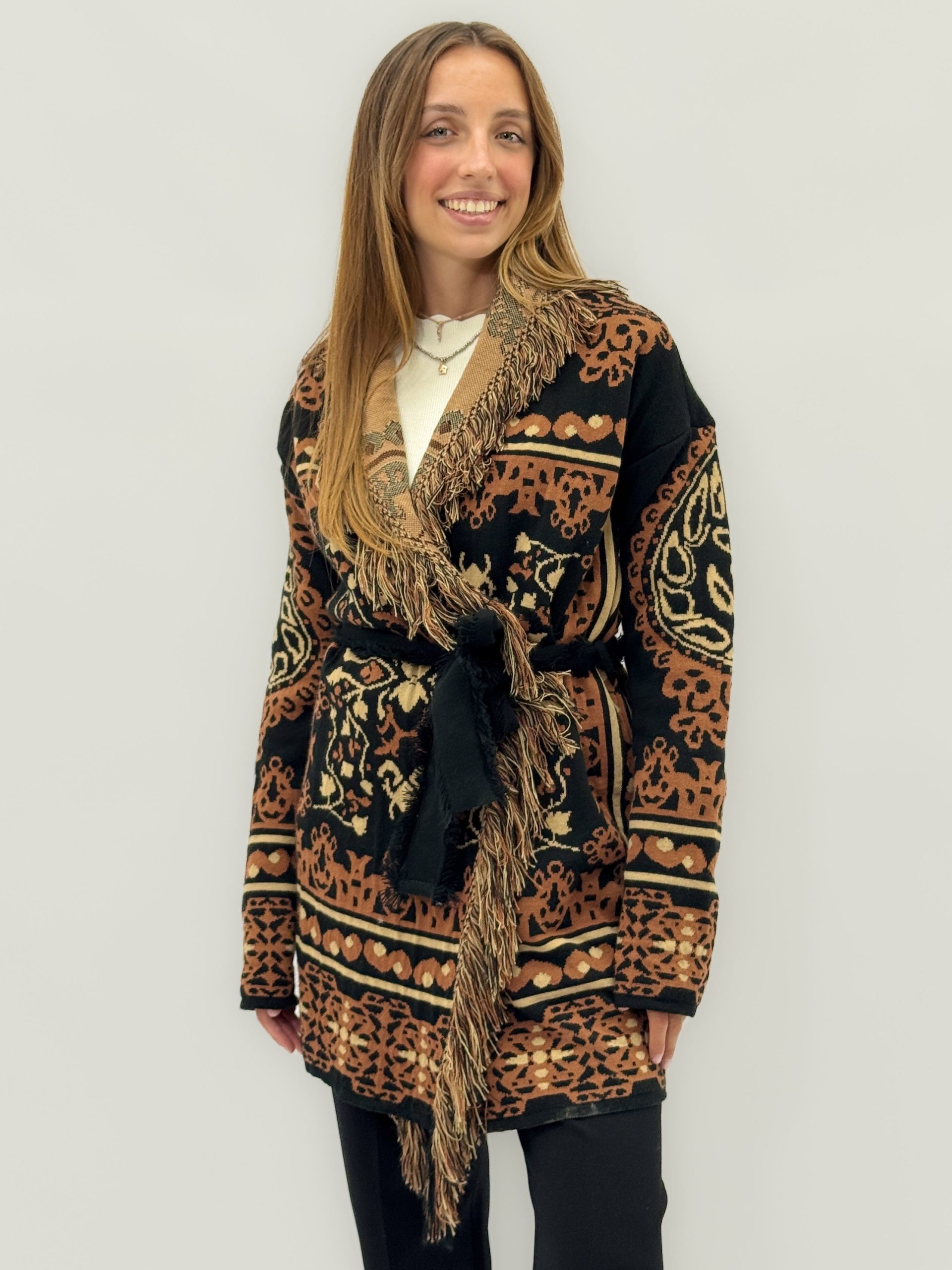 Cardigan fantasia etnica con cintura e frange – MaxModa Brescia