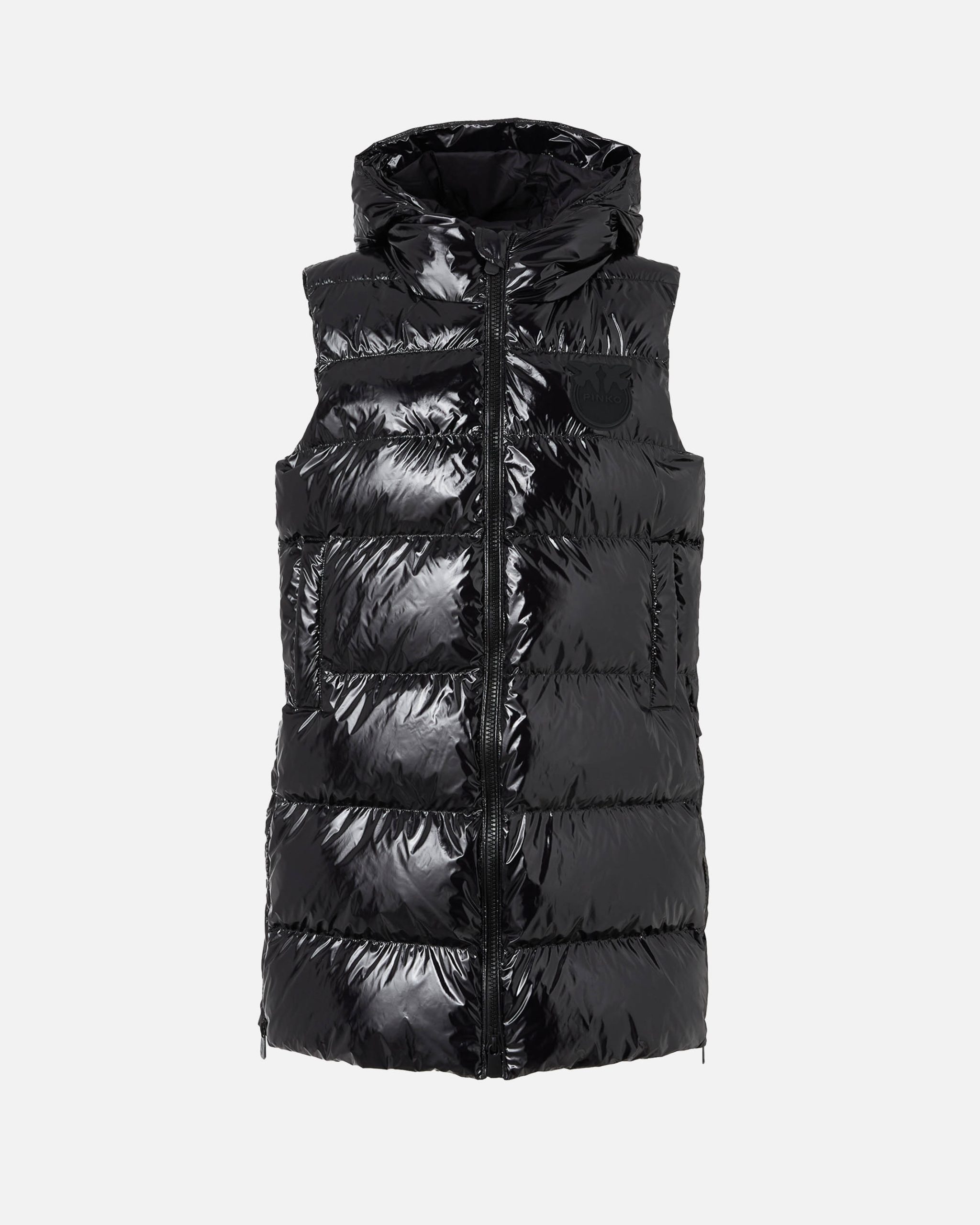 Piumino lungo smanicato nero con cappuccio in crystal nylon imbottito e trapuntato
